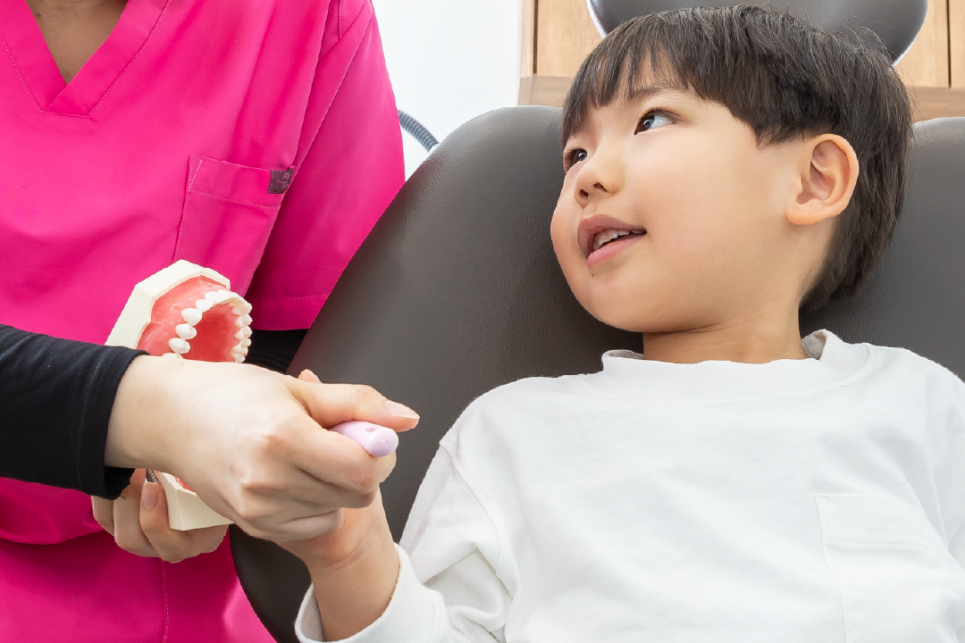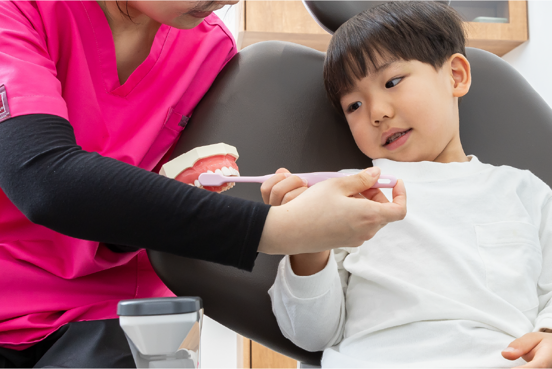 染め出し液を用いた磨き残しのチェックや、お子様のお口に合わせた歯ブラシの選定、親御さんへの仕上げ磨きのアドバイスまで丁寧に指導いたします。