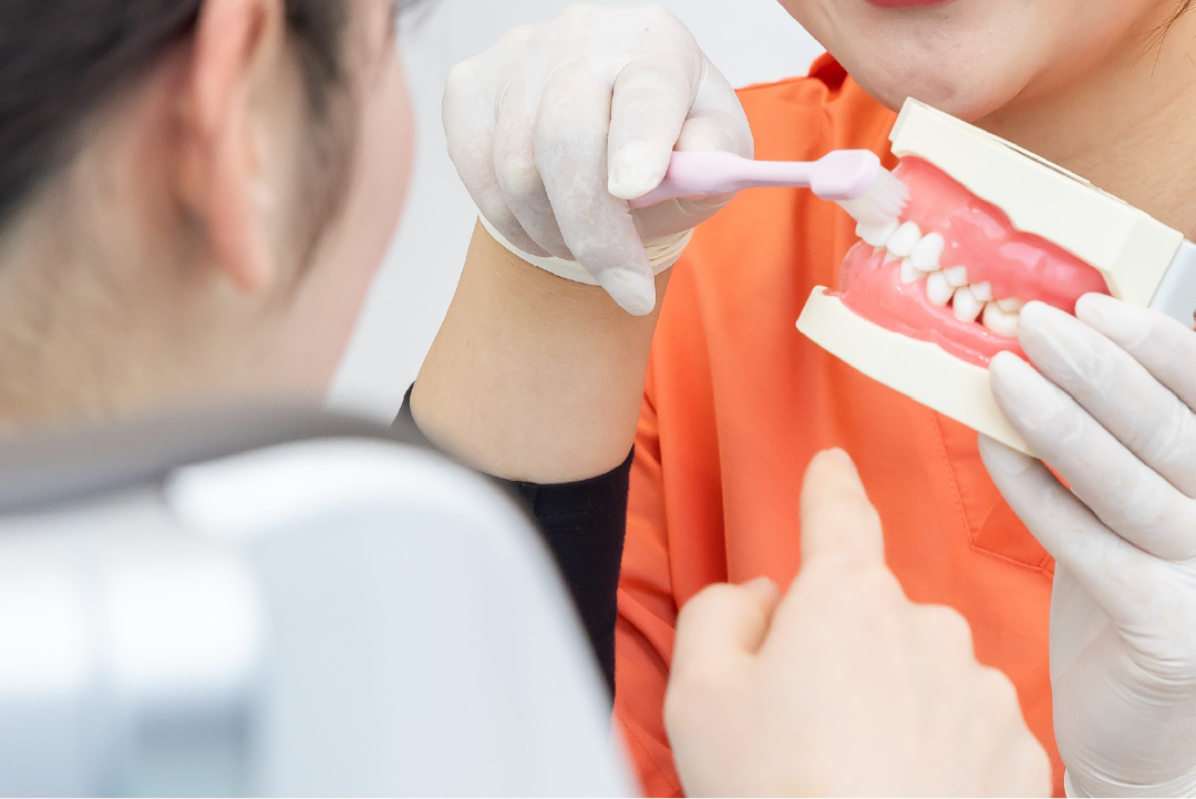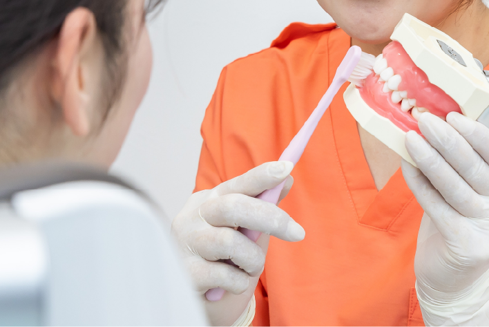 汚れが残りやすい箇所を実際に見ていただいてきます。歯ブラシの当て方や、歯の形に合わせた磨き方をお伝えし、ブラッシングを改善していきます。患者様のお口の状態に合わせた歯ブラシやケアグッズの処方も行っています。