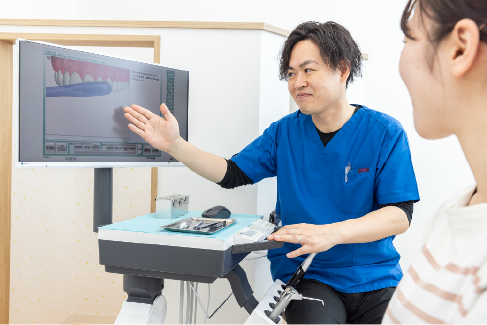 お口の状態により、治療が複数回必要になることがあります。患者様が不安を感じたまま治療を進めないために、治療内容や経過についてわかりやすく丁寧にお伝えします。口腔内カメラとモニターを用いて治療前後の口腔内の変化を確認することができます。