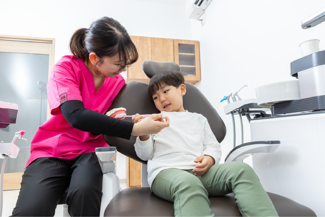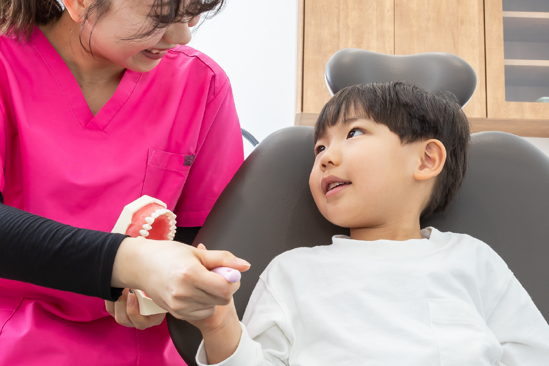 染め出し液を用いた磨き残しのチェックや、お子様のお口に合わせた歯ブラシの選定、親御さんへの仕上げ磨きのアドバイスまで丁寧に指導いたします。