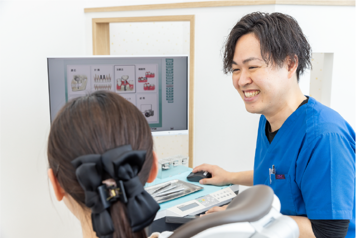 お口のことはもちろん、身体のことや、食生活、生活習慣について患者様が今気になっていることについてお話をお伺いします。不安な気持ちを解消していただけるように、ひとつひとつのお悩みに丁寧にお応えいたします。